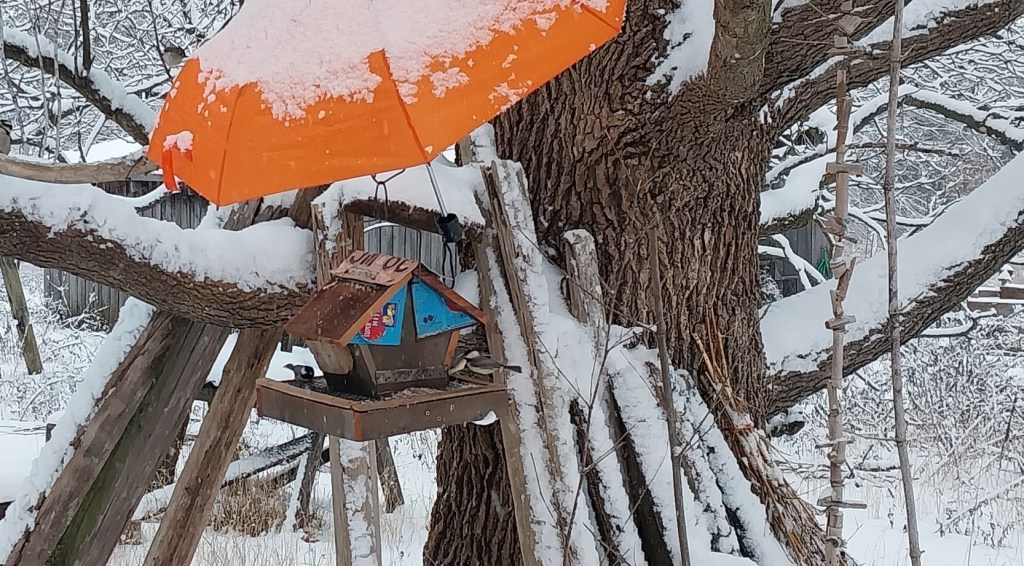 I had to bring in the squirrel-proofed bird feeder as the ice fell so thickly into the seed, the birds couldn’t reach it. Would an umbrella protect the feeder? I’ll try it and see what crazy results I get. The Head Gardener will give me a rough time with this, but sometimes I purposely do these ‘unique’ things to get her goat.