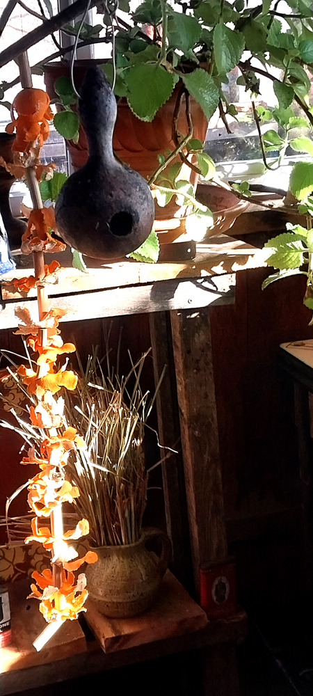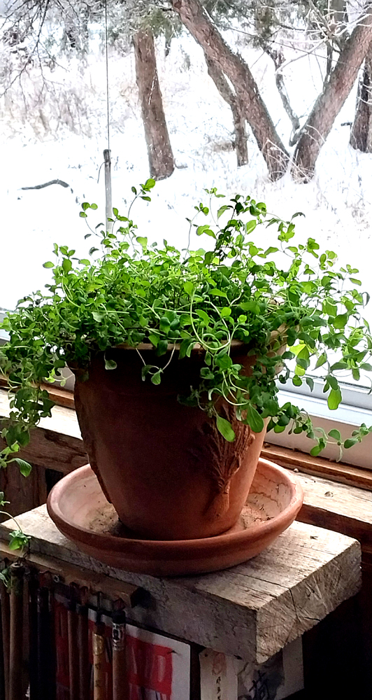 Inside I’d walk by the rosemary and marjoram, rubbing their leaves. The fragrance buoyed me and the simple beauty of the plants did as well. It’s like having a silent friend in the house, marjoram my favorite.  I carefully took off the skins of my clementines, also fragrant, and strung them with these bamboo pieces to add cheer to the house. I’d brought up potting soil and containers before the storm and sowed the onion seeds, the red Wethersfield and the yellow of Parma. By mid-March the seedlings will be large enough to plant in the garden. Spring, just the word gives me hope.