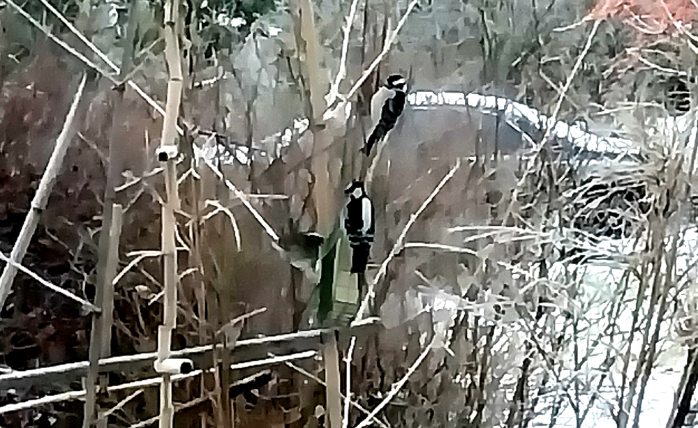 The birds devoured the suet. Sometimes there were four different birds taking bites out of one suet cake.  I put out another holder with suet so they wouldn’t fight so much. Of course that didn’t really work. The small birds, chickadees, nuthatches, sparrows, cardinals and snowbirds, cooperated but oh my, the jays, the woodpeckers, the mockingbirds, insisted they have the suet to themselves. They kept me entertained as I watched their dramas unfold. The bamboo jungle gym stayed active. Birds darted up and down, swung on the long bamboo string, pushed each other, puffed up their feathers until they looked three times their size.