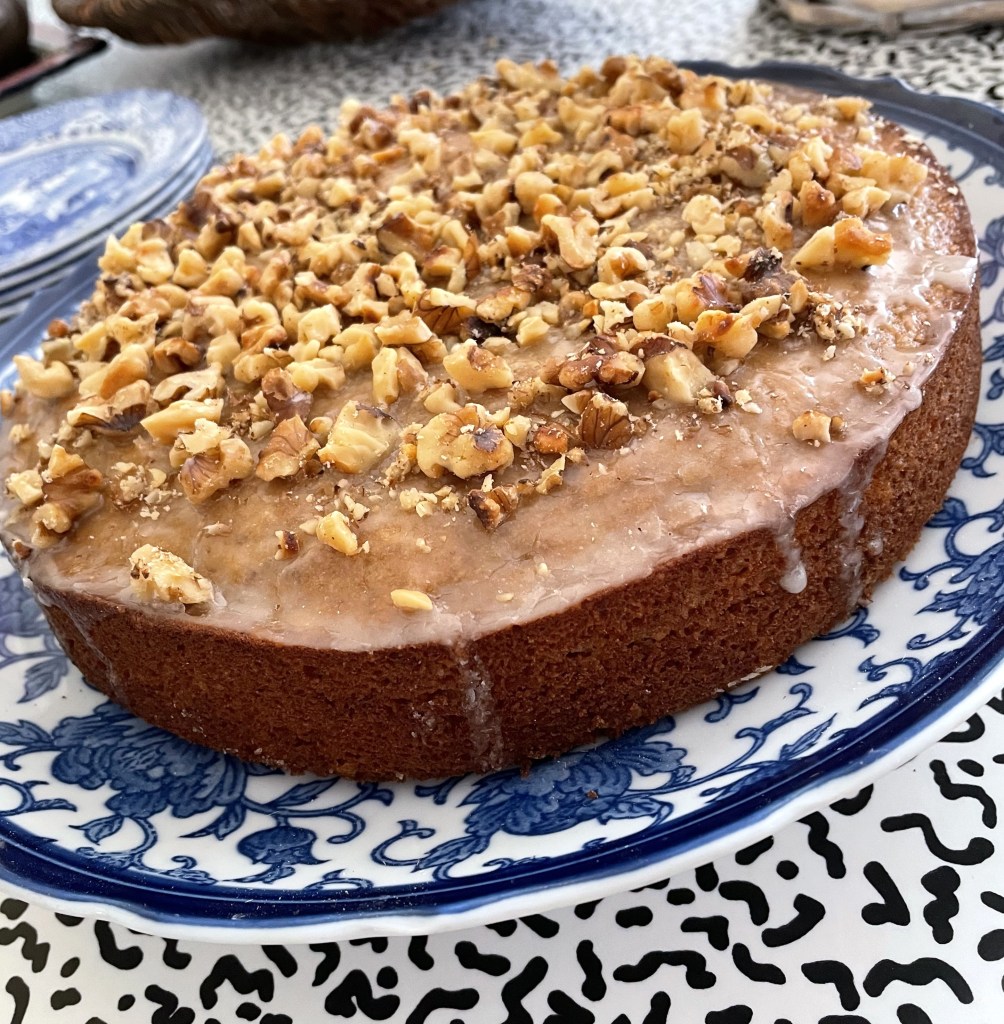 Fold in the quinoa flour, the ground walnuts, one cup unbleached flour, one tablespoon baking powder and one teaspoon kosher salt. Scrap batter into a buttered nine-inch springform or round cake pan. Bake at 350° for 50 – 60 minutes until a skewer comes out clean. Cool in the pan for ten minutes. Remove and top with a thin glaze½ cup sifted powdered sugar mixed with a teaspoon or more of lemon juice. Top with the chopped walnuts.