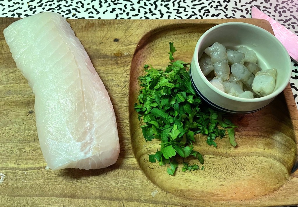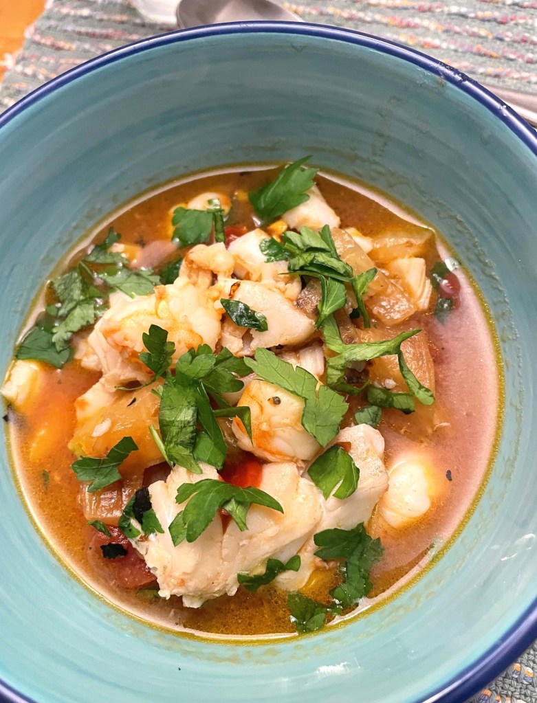 On these cold, gloomy days full of national turmoil and worry I look to comforting dishes to cheer us up. I have many new cooking inspirations and often forget past favorites. Then the yen for those familiar flavors pops up. This fish soup had been a mainstay of my cooking, a favorite dish for company. One cold evening a simple take on the recipe seemed like just the thing for our dinner. I usually have most of the ingredients in my pantry and freezer.