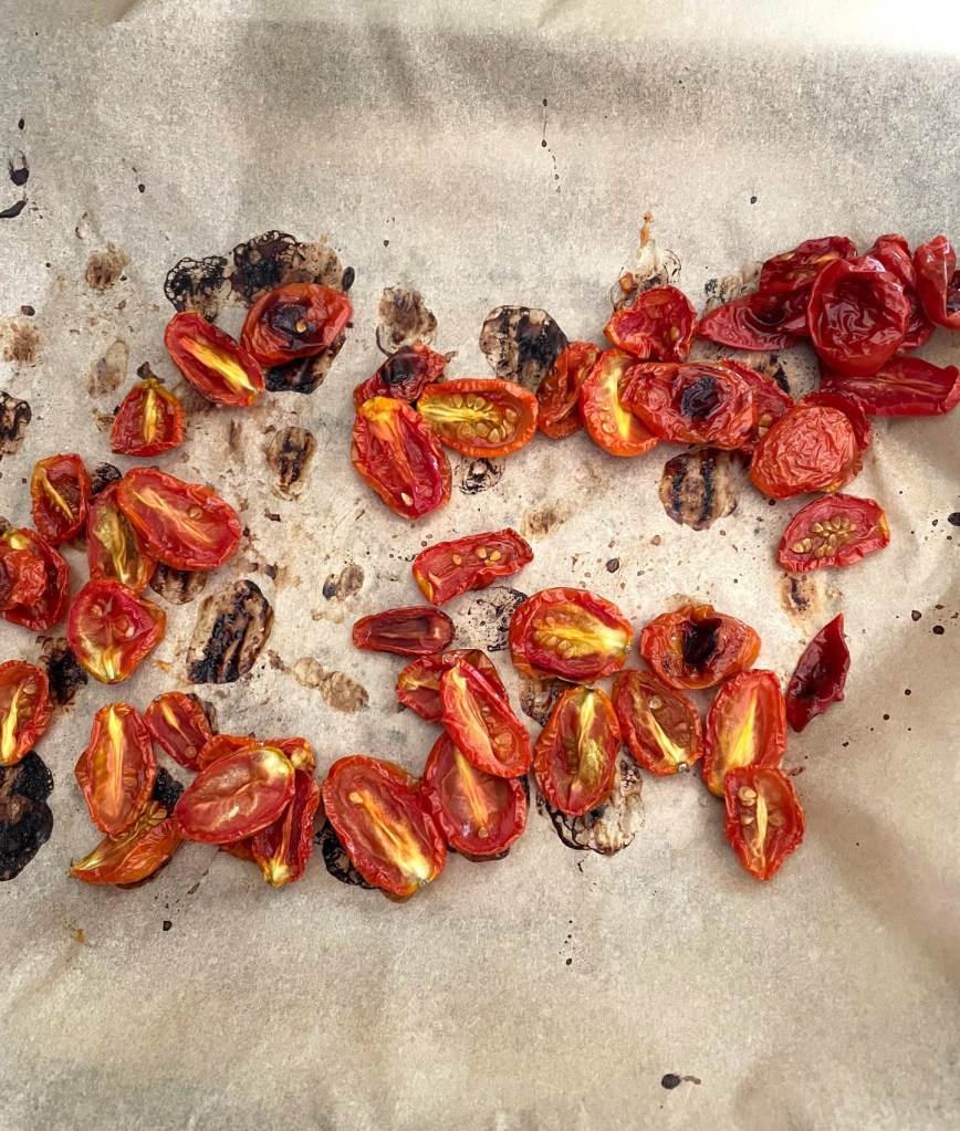 Deep in winter I long for the sunny taste of garden tomatoes. Alas, winter produce just isn’t the same. But the readily available cherry tomatoes are delicious when simply roasted. Halve the little orbs and spread on a baking tray lined with parchment. I do this in my toaster oven. Lightly sprinkle with coarse salt, just a couple grains on each tomato. Bake at 350° for an hour. Watch in the last minutes so they don’t burn. Store in the fridge and add to salads and pasta dishes.