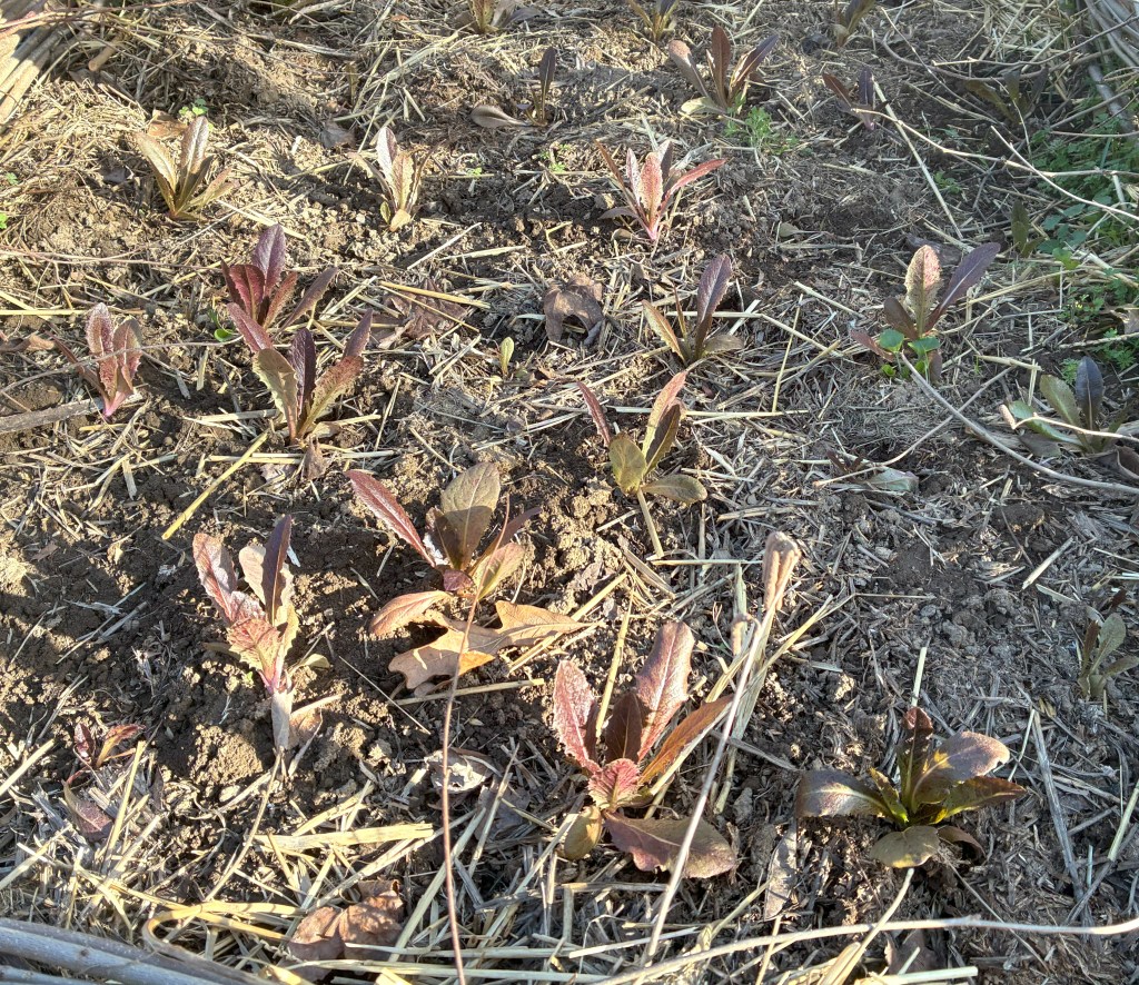 Today feels like March, brisk and chilly, even have a fire in the heating stove. Sun pours into the house. I need a sweatshirt when I go outside to admire the really red deer tongue lettuce seedlings, the daffodils and emerging plants, everywhere! I know not to become excited. We had busted pipes in our trailer down in town when we moved here and Johnny Mahaney had to crawl under our rental trailer to fix the break. I let the excitement simmer, starting tomato seeds, watching the peppers and eggplants grow, ready for another cycle on Strawdog as I watch the transformation of the earth.