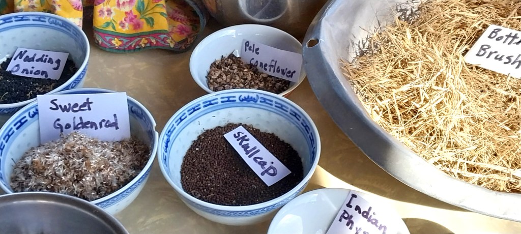 We sow one variety after another. She asks me, “Why can’t we dump all the seed into pillow cases, mix them up, then sow them all. That’d be a lot quicker.” I agree with her. It would be quicker. And I explain, in order to do that, all of the seed would have to have the same requirements (staying far away from any poetic language). But, I go on, some of these seeds need shade, some like dry conditions, some are tall and need to go in spaces where they won’t overwhelm other….”Ok, ok, I get it. And you know what each of these seeds need, smarty pants?” “Mostly,” I say, “yeah, I’ve lived with them for years. They’re part of the family here on Strawdog. I visualize each flower in the quadrant before we sow them. It’s intuitive at this point. I just know if it’ll be happy, because I know the plant and what each of these quadrants have and don’t have.  It’ll take several years for the seeds to produce flowers, natives grow slowly, but look at these quadrants that produce beautiful flowers now. It used to be fescue here. Imagine that.” (uh oh, I asked her to use her imagination!)
