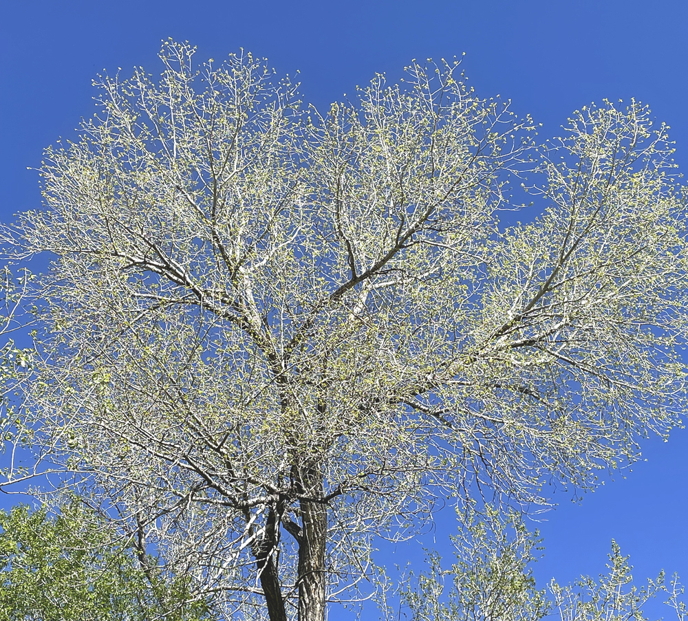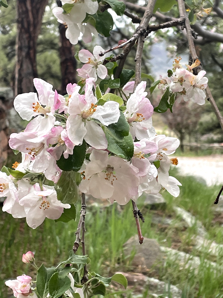 With the unfurling pale yellow-green leaves and the powderpuffs of pink and white blossoms on the fruit trees, spring is springing up here in the foothills of the Rockies. Over a lattice of branches, a pale green haze of new leaves shimmers against the blue, blue Colorado sky. On our hillside sand lilies nestle in the grasses emerging from beneath the dried stalks of last year.