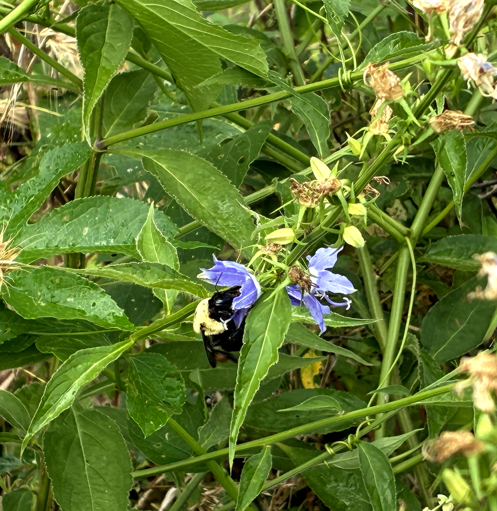 Once I’d put in my hour in the early morning, the rest of the day had me engaged with other sights, other problems, like keeping the rabbits out of the late summer beans, or admiring the tomatillos and the salsa verde they’d provide. Will the figs mature before a frost? The pollinators always keep me entertained. How does that big fat bee get into the American bellflower?!