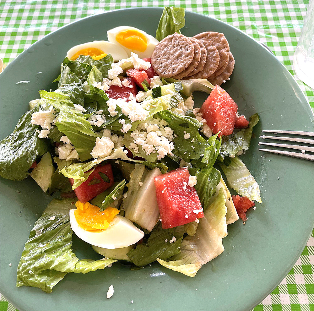 I’ve been making simple meals, mostly salads. A favorite pairs watermelon chunks, lettuce and spicy greens like arugula and radicchio, feta crumbles, and a simple olive oil and lemon dressing.