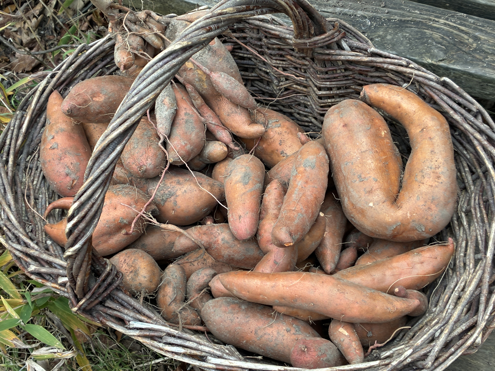 The sweet potatoes have never been more beautiful or prolific. Because they were grown in the container garden, in a wooden box, one foot wide by two feet long and one foot high, the voles didn’t dig their way through the soil, spoiling the potatoes as they usually do in the regular garden. These boxes have no bottom to them, so they roots can go as deeply as they need to for the roots to pump up water and nourishment.
