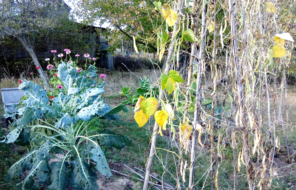 On warm autumn days, after freezes and temperature drops, the garden takes on a new complexion, one I haven’t seen for a year, one that startles me a bit, but like an old friend, soon I remember this face. The familiar gestures, dried stalks of once vibrant tomato plants, bean pods draped high up on the bamboo tepees, (so high I’ll need a rake to dislodge), and zinnia seed harbored inside seed heads that look utterly dead, remind me of other autumns. So many secrets these plants hold about water, disease and fertility. Like reading tracks in the snow, a seasoned gardener learns about her garden as she dissembles it.