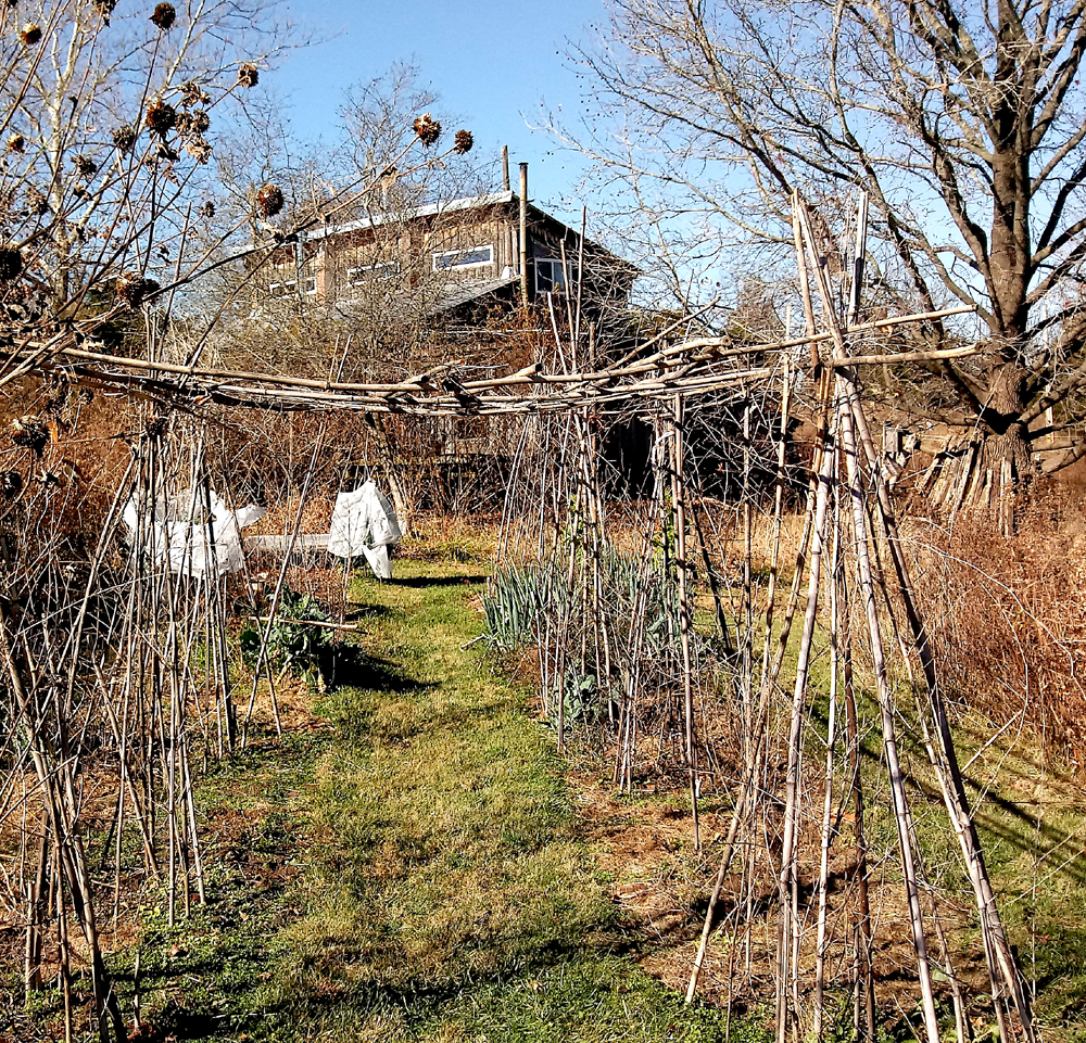 The barriers I had put at the base of each teepee to keep the rabbits from nibbling, also get rolled up, tied and stored in the hay barn. Pieces of bamboo, from short to long also go in special places. This year they went into tomato cages, placed around the cattle panel trellises, that act like bins at a lumber yard. Why did it take me years to see this obvious solution? And the long, long pieces of bamboo? They simply go on top of the bamboo arbors, something I couldn’t do when we built curved arbors. It’s such fun to see my workshop prepared for winter. I smile with delight and appreciation of good weather to do the fussy work.