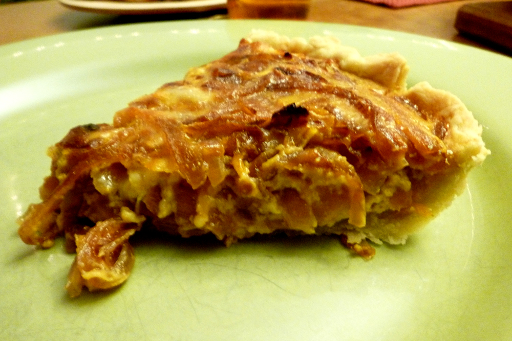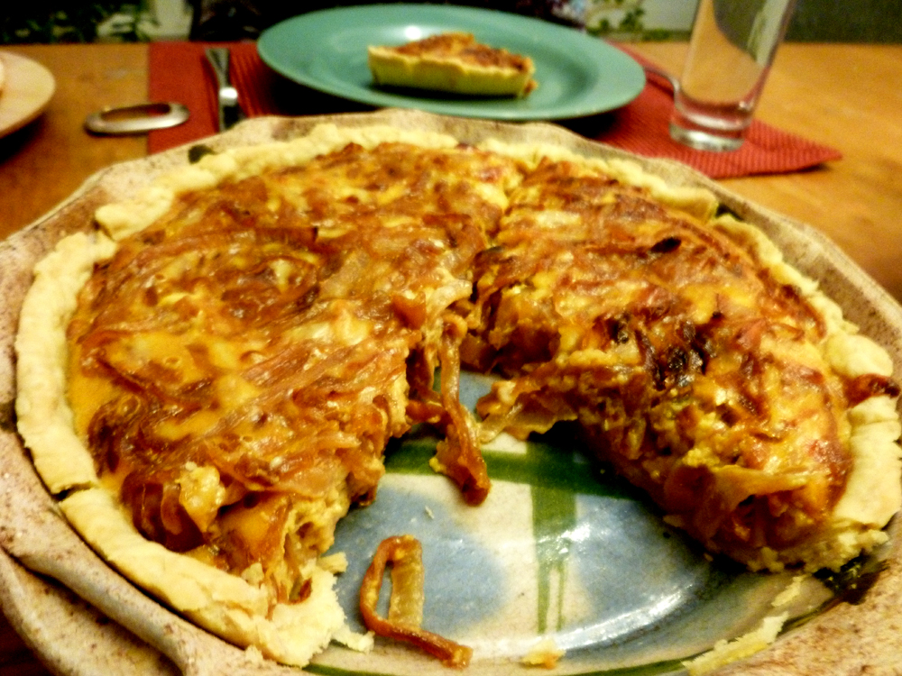 Combine the cooled onions with 1/2 cup half-and-half or milk, 1 large egg, 3 ounces grated Gruyere or cheddar, and five or six grinds of black pepper. Fill the shell and bake at 375° for 25 – 30 minutes. The center may be slightly jiggly but will firm up as the tart settles.