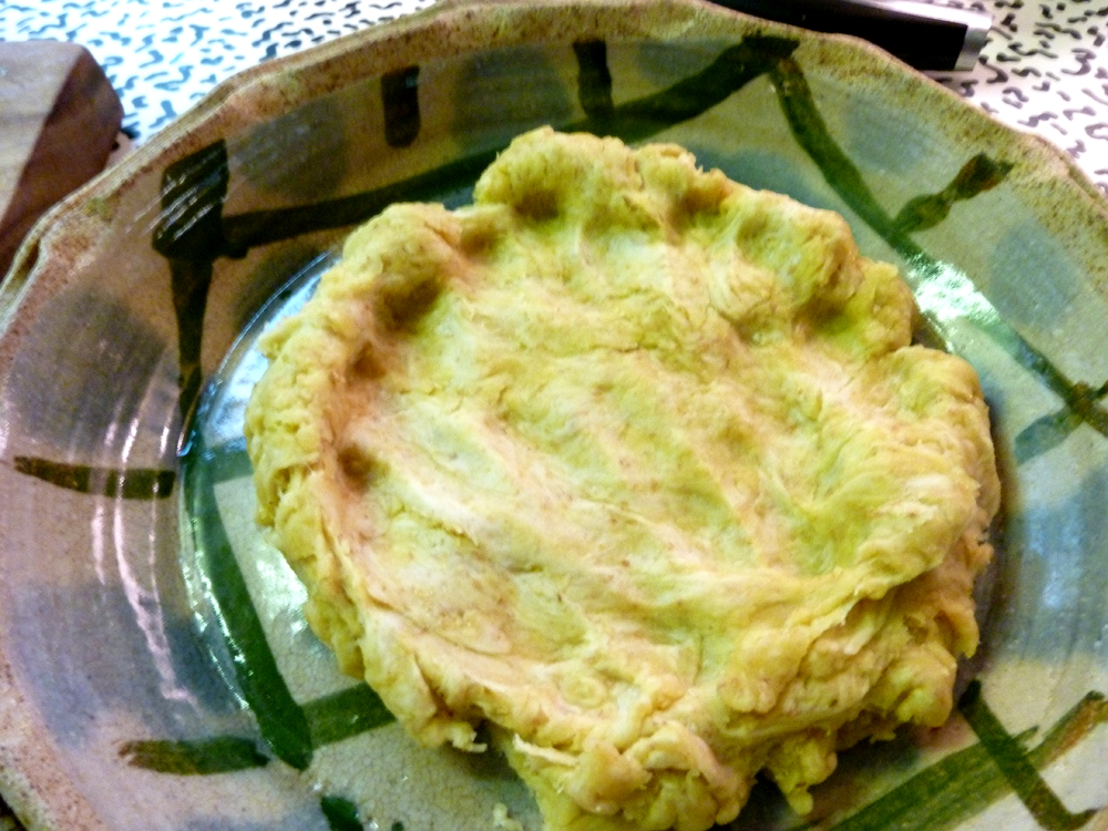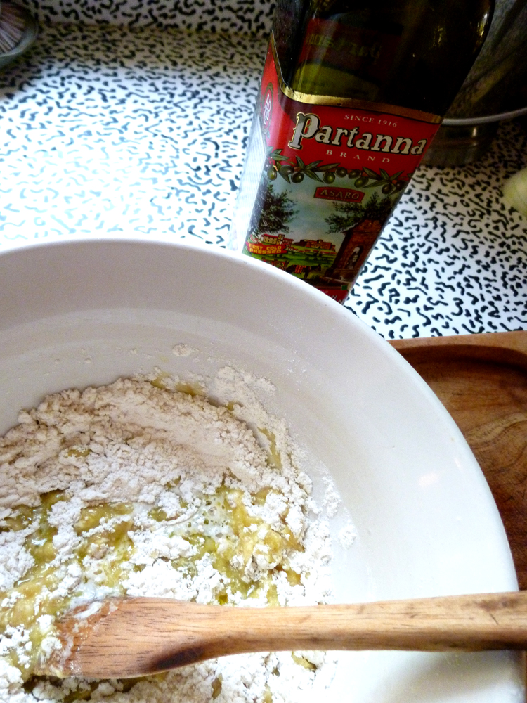 Combine 1 cup unbleached flour, a big pinch of salt, 1/4 cup olive oil and 1/4 cup water. Press the dough into a 8 – 9 inch pie plate or tin. (I used a Betty Woodman dish.)