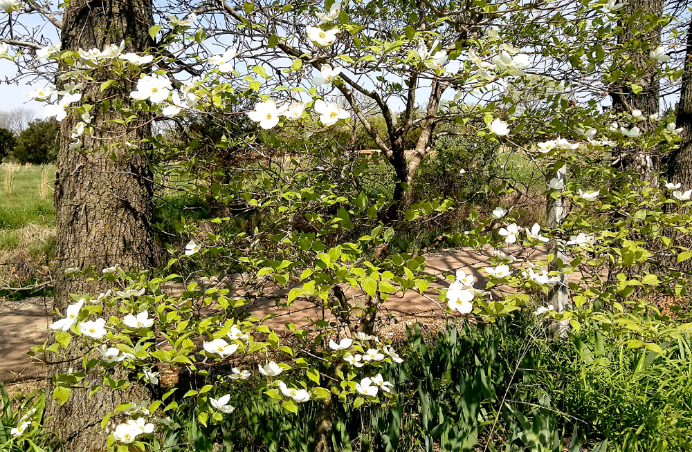 I’d been eyeing Our Lady’s winter garb on warm April days and kept saying, “I need to change her clothes, give her the lightness and airiness spring suggests”. Every time I walked by her, she had her head down and seemed absorbed in some kind of reverie. So I let her be even though the 60° nights suggested spring indeed was in full flower. In fact, the cavalcade of redbuds, wild plums, golden currant, Dolgo crabapple, daffodils of every category, blue bells, celandine poppies and so many more early flowering plants made me dizzy visiting them, showing my appreciation for old friends returning, smelling, touching, all that we need to do after a long, dark winter.