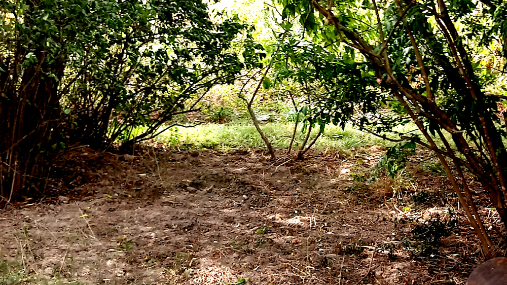 Poison ivy turns me into a mad woman. I go after those vines, carefully, but with determined energy. The hoe searches for the source of those running vines and then slays with bold strikes. (The vines grew around the button bush, the lone shrub in the back-middle of the photograph below, a butterfly magnet.) By the time I’d finished flay-ling about, the earth looked like a pig had rooted in the area. Let no root go unturned became my motto.
