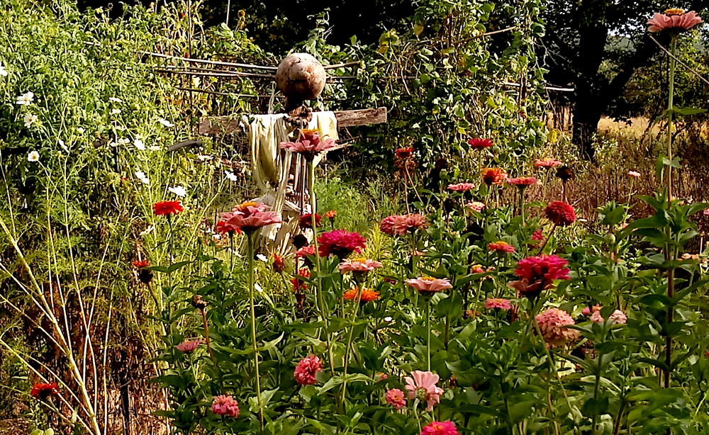 I’ve also watched the monarch caterpillars growing from little specks to big enough to go into chrysalis. You’ll see a sprouted monarch on one of the sad zinnias. Water in the bird baths has been number one on my list of chores. Everything from tiny bees to butterflies to birds of every sort have used these baths during the drought. The deer come at night. To watch a bird taking a bath is truly one of the seven wonders of the world. These small tasks take on a more significant hue in a drought. I have time to linger, to enjoy, and not scurry about trying to conquer the world on all fronts.