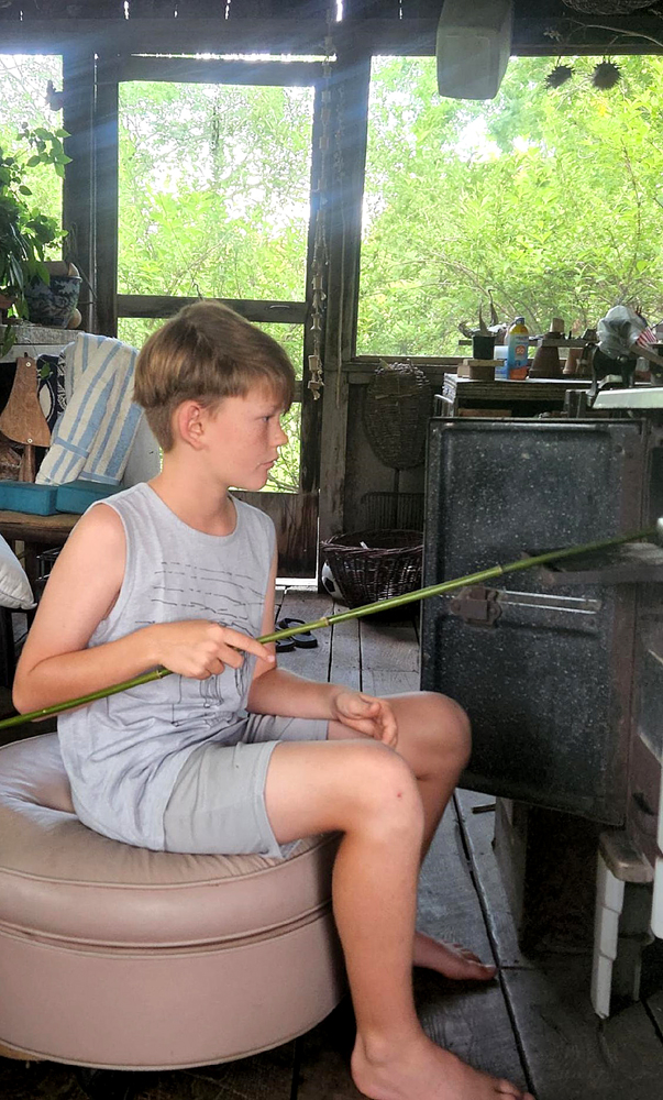 When Brady and Logan come, I concentrate on them. I still have to do basic gardening chores, but mostly I cook what they love, take them to the creek, horse around, and soak up their enthusiasms. Brady tries to cream me at Monopoly. I, uhhum, “let him win”. Well, sort of. That’s another story. And Logan’s my bedmate. We sleep, all 4 of us, out on the summer kitchen, listening to the night sounds, watching the flickering of the fireflies, hearing rain on the tin roof, an armadillo scratching around under the house.