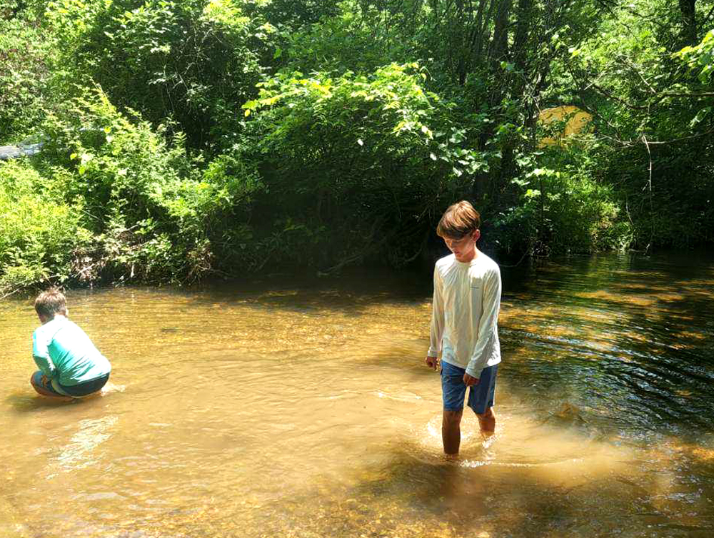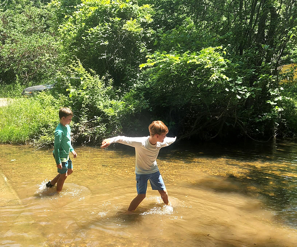 We went to Mistaken Creek, a creek that runs through our bottom land, three or four times. It’s another world down there. No garden, but wild and carefree, plants of all sorts jumbled together as seed from upstream, overhanging trees, critters and whatnot, find their way into all sorts of nooks and crannies. I feel free, just like the boys must feel. I test myself on the plants, saying one name after another,  while the boys are immediately into skipping stone mode. I’ve watched Brady go from not being able to skip at all (while his dad, Kerry, skipped with such power his arm made a whirring sound) to skipping stones all the way across Third Creek, 100 feet wide, hitting the rocks on the far side. He now has some of the power that awed me in his dad and an arm that never seems to tire. Logan, 2 ½ years younger, has caught on. He’s built like an attractive tank and will someday be a force to reckon with. Now he can’t quite compete with Brady, but we warn Brady, his time will come and it may not be pretty.