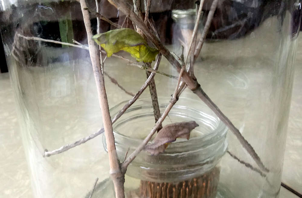 Hilary found a pipevine swallowtail caterpillar as she mowed. Logan had a bug box so she brought it to him. It was a mature caterpillar and looked like it would go into chrysalis soon. We put that caterpillar and one Logan found on the screen door into this jar and in a few days they both had gone into chrysalis as if it was staged. Logan lamented he wouldn’t be able to see the caterpillar emerge, as he had learned in school it took several weeks. I’ll see it all and send him a picture, you readers too.