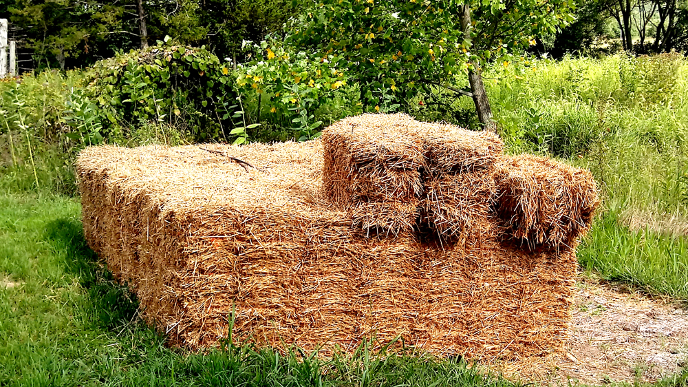 She spotted the straw stacked up and wanted to see it. She loves the smell of fresh straw. We walked over to the pile of beautiful golden straw. A week before, I told her, Jeremy called to say he had our straw.  He enlisted the help of Petra to move the 4 stacks of 21 bales each with her tractor, taken off of Jeremy’s flatbed trailer.  I told the head gardener Jeremy said they could’ve unloaded the straw bale by bale, but Petra was happy to help and seemed to enjoy showing the guys how a woman can easily lift a ton of straw with hydraulics and a calm demeanor. The head gardener smiled at that. (Phew… I continued with the story as it seemed to amuse her.)