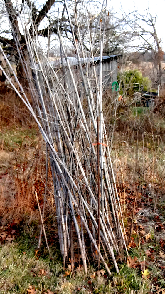 Look at how neatly the head gardener uses the obvious storage holes for the unbranched bamboo. When she threads the pieces into these openings it feels like we have a bamboo lumber yard. Sometimes I’ll amble over to the storage bins and poke in some bamboo pieces. She frowns at me. “One at a time,” she’ll shout! Oh yes, she loves order and if one piece is poking out, she’ll take out the whole lot and redo it so it’s neat and tidy. I have to confess, it does make it much easier to get them in, in the autumn and out, in spring. Come spring these horizontal canes provide a sheltered space for a vining plant to begin to grow, protected and shaded once the summer sun comes.
