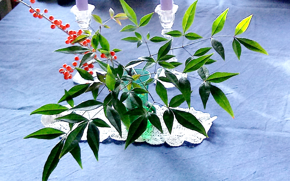 Several friends have asked what’s in the bouquet: Heavenly bamboo(nandina domestica); and deciduous holly berries,(ilex decidua). The first non-native, the second native.