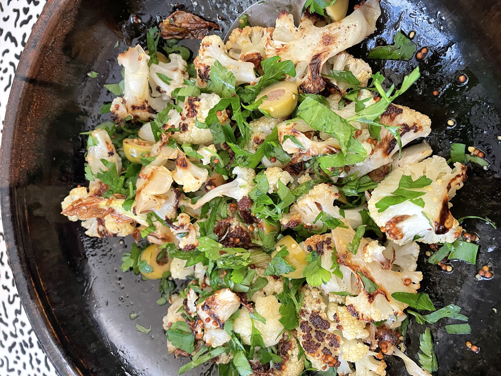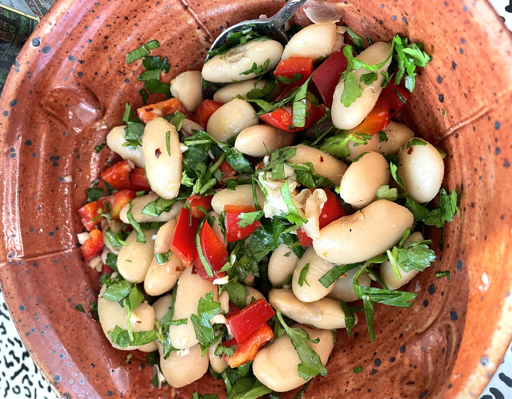 I had a bag of Royal Corona beans in my Rancho Gordo stash, perfect for a winter salad. After cooking them until tender I marinated the large beans in a lemony, garlic vinaigrette, added diced red pepper and parsley. For the cauliflower salad go to Busy day dinner for the recipe. I had wonderful anchovy stuffed Spanish olives – a gift from the VanDyks – to add to this favorite dish.