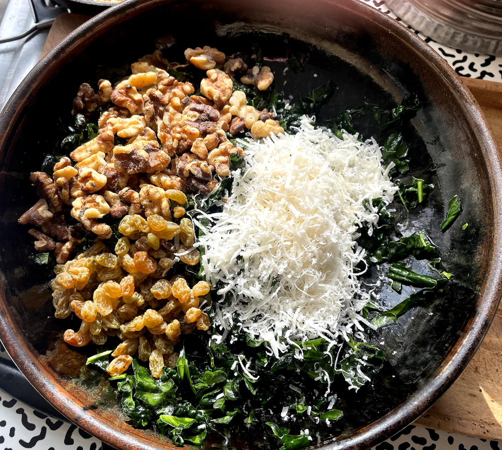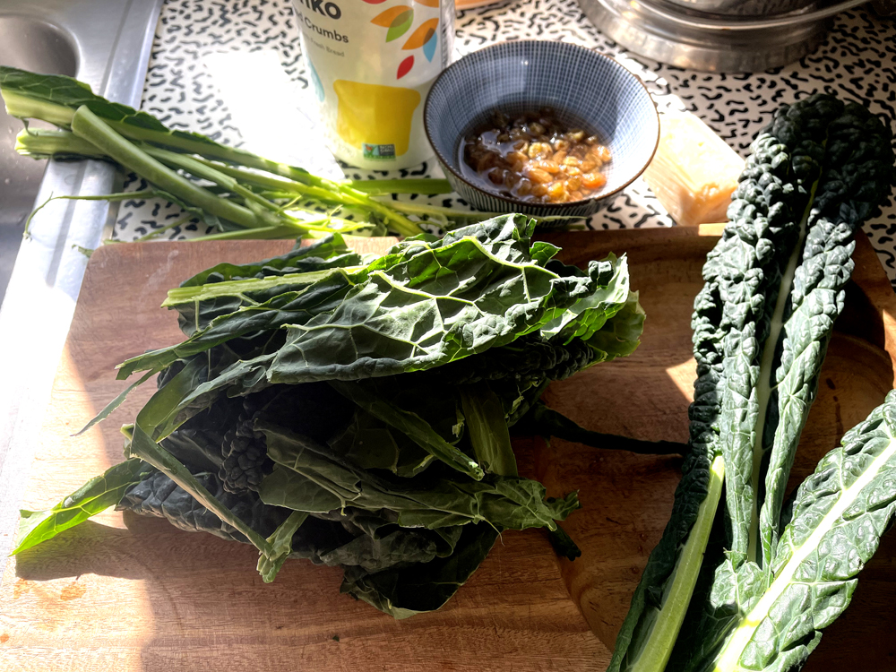 Toast ½ cup of walnuts, watching carefully so they don’t burn, about 3 minutes at 250° in the toaster oven or in a small, heavy skillet on the stovetop. Combine ½ cup panko or other bread crumbs and a clove of finely chopped garlic in a small skillet with a tablespoon of olive oil. Toast until light brown, a couple minutes over medium heat. Grate ½ cup parmesan. Toss together the kale, walnuts, parmesan, and the drained sultanas. Top with the bread crumbs just before serving so they stay crunchy.