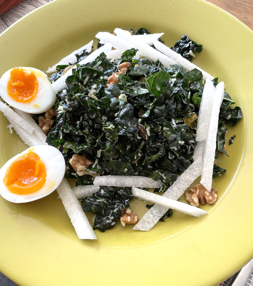 Cut the kale leaves away from the tough stems and slice into narrow ribbons. Put into a large bowl and add a tablespoon of olive oil and a big pinch of salt. Massage – squeezing and rubbing the kale until reduced to half its bulk, about 5 minutes. In a small bowl cover 2 tablespoons of sultanas (golden raisins) in a tablespoon or two of red wine or cider vinegar. Let marinate while you toast 1/2 cup walnuts. Stir 1/2 cup of grated parmesan into kale, add drained sultanas and walnuts. Garnish with julienned jicama, boiled eggs, avocado slices or cherry tomatoes.