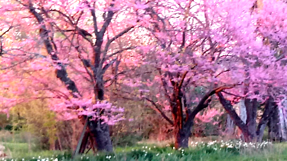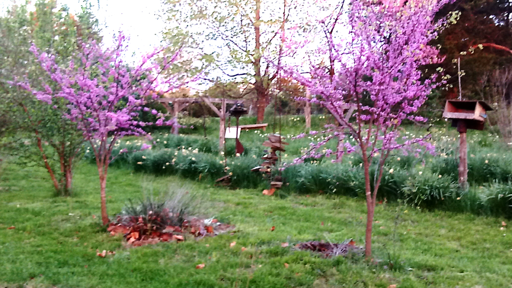 After this conversation with the head gardener, I refrained from opining with her on how the redbud trees add another dimension to the landscape, I guess you could describe them as a flourish, that magical element that brings the surrounding trees and understory alive. I could not have pre-planned this. I did not have the vision or the luxury of time to see all the possibilities of the homestead. My nose was to the grindstone, like most of us in our daily working lives. Now that I can lift my head and stroll around, seeing what seedlings appear where and how they’d fit into the entire landscape, I have a new freedom. It excites me every day. Of course now I run out of energy and have to pace myself, but the vision becomes clearer and gives a thrill to these spring days.