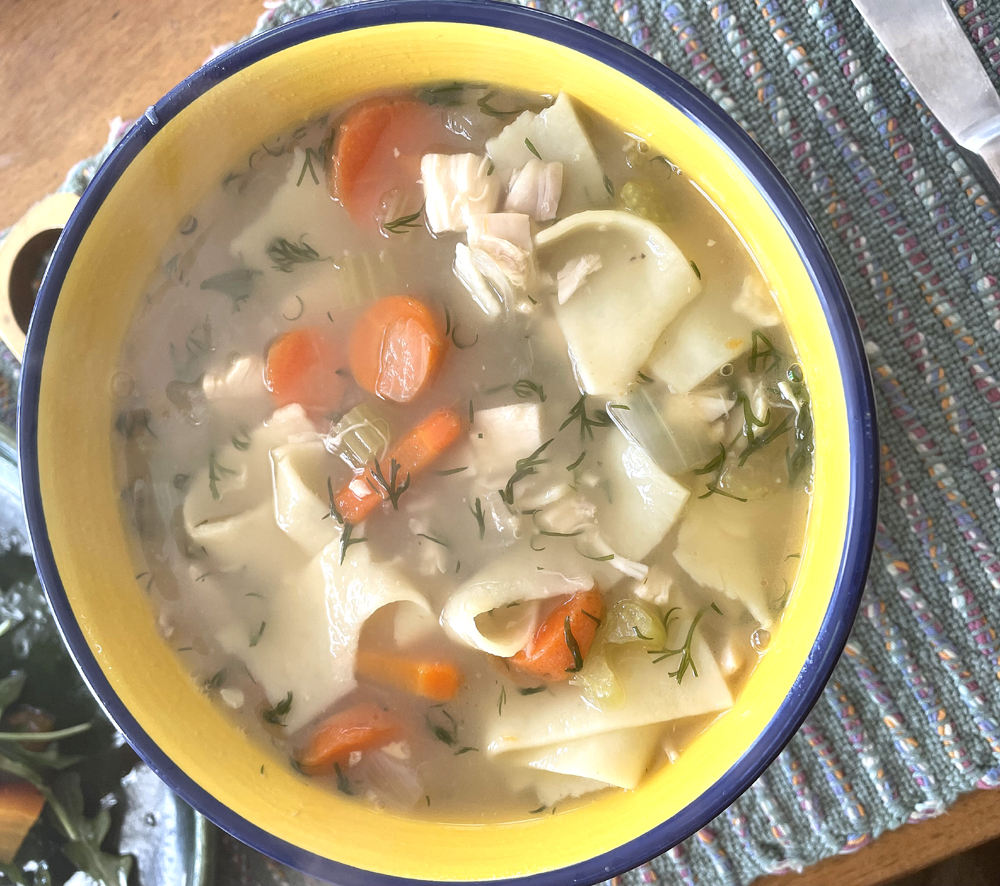 In two tablespoons of butter or vegetable oil, soften a medium-size onion, two ribs of celery, two carrots, and a fennel bulb all cut in ½-inch pieces, and a couple of cloves of garlic, chopped. Add 4-6 cups of your best chicken stock, a handful of chopped fresh dill, and a little salt. Simmer gently until the veggies are tender. Add a cup or two of water if the stock has reduced and drop in two-four ounces of egg noodles. When tender, slip in 2 cups of shredded chicken and additional dill. Heat for a few minutes, taste for salt and pepper and serve. I use the stock from poaching the chicken with a carrot, onion, celery and parsley. Use boxed stock or Better Than Bouillon if that’s what you have. And a rotisserie chicken would make this even easier.