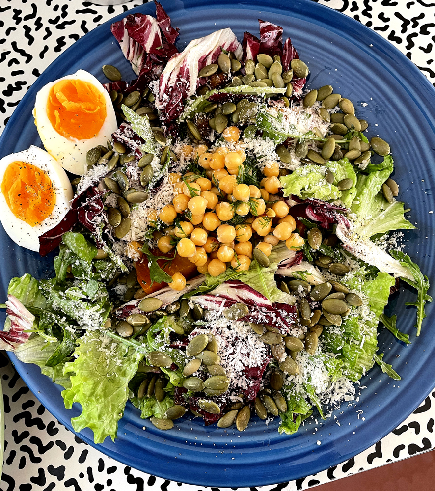 Marinate a cup of garbanzos, freshly cooked or canned, drained, in a teaspoon lemon zest, a big pinch of red pepper flakes, a tablespoon or two of lemon juice and 2 tablespoons olive oil. Add salt to taste and minced dill or another favorite fresh herb. Add to a salad of mixed greens and radicchio dressed with olive oil and lemon. Top with grated parmesan and toasted pepitas. Add a jammy egg if you like.