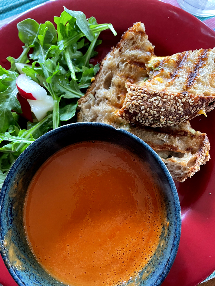 Yesterday we had a classic lunch of tomato soup and grilled cheese sandwiches. This soup is the only one I buy in a box, Red Pepper and Tomato soup by Pacific Foods. It’s nice to have in the pantry for those days I’m rushing to make lunch. But I’ll make chicken noodle soup for dinner tonight.
