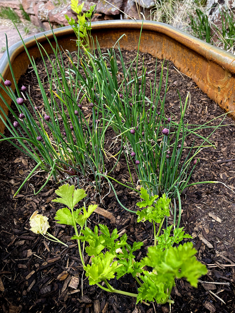 With the night temperatures still in the 30s and 40’s I’m late to plant the garden – some snap peas in April and lettuce last week. We did prepare a new herb garden in an old, leaky stock tank. I’ve wanted to have a supply of nearby herbs to grab when I’m in the midst of a recipe. The garden (and the herbs growing there) is on the far side of the studios, too far for an impatient cook. I’ve transplanted chives and garlic chives, bought parsley plants and sowed cilantro seeds. I will add a tarragon plant and basil seeds when the weather warms up.