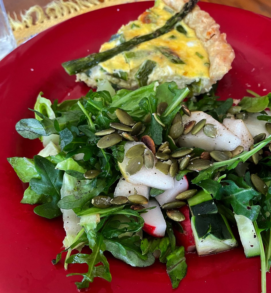 In a bowl combine 3 large eggs, ½ cup of half and half or milk, 2-3 ounces grated Gruyere, Comté or cheddar, ½ cup freshly grated parmesan, 3 green onions (scallions) cut across into ½ inch pieces. (Use the whole onion, white bulb and green tops.) Mix in the asparagus pieces and pour it all into the tart shell. Top with the six whole asparagus stalks arranged in a pinwheel. Bake at 375° for 30-35 minutes until set. Let sit for 5 minutes before slicing into wedges.